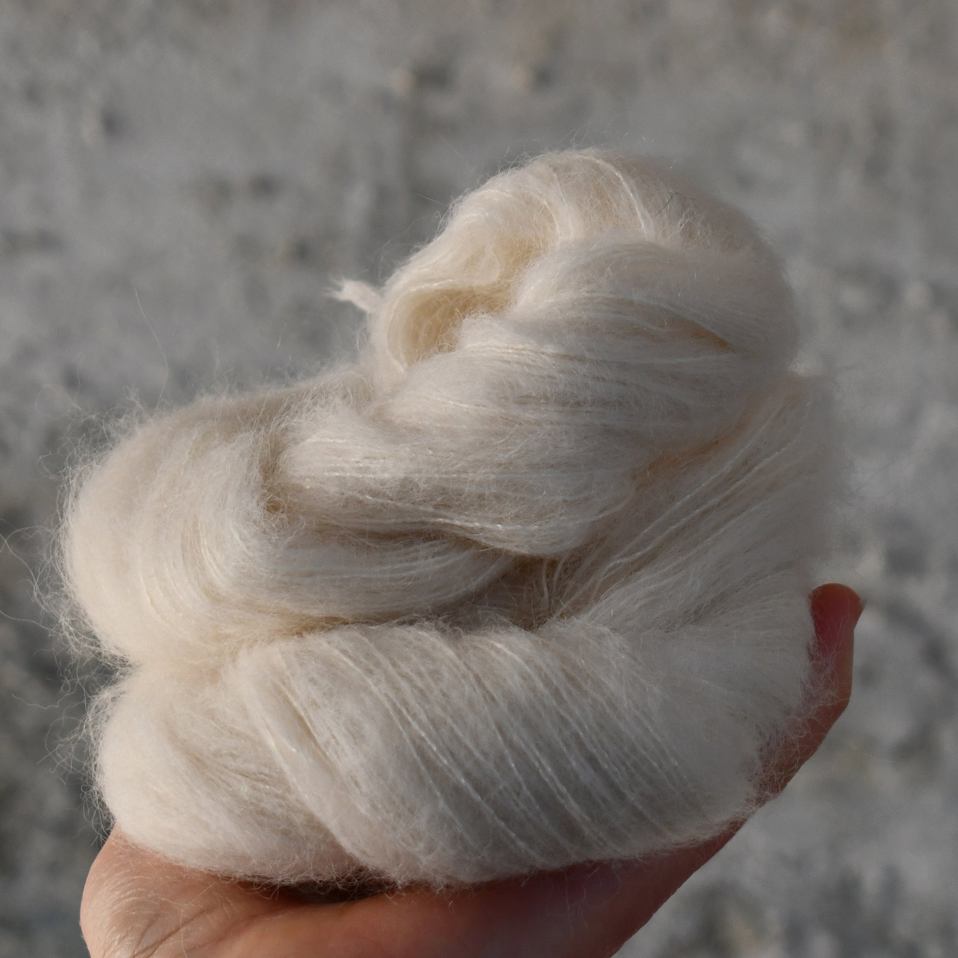 This compliments our suri silk cloud range, with the addition of the sequins. This sucks up the dye and produces lovely watercolour effects. Speckles will spread on this yarn. The sequins reflect the colour underneath providing gently twinkles in the fabric when knitted. The fabric is soft, floaty and warm.